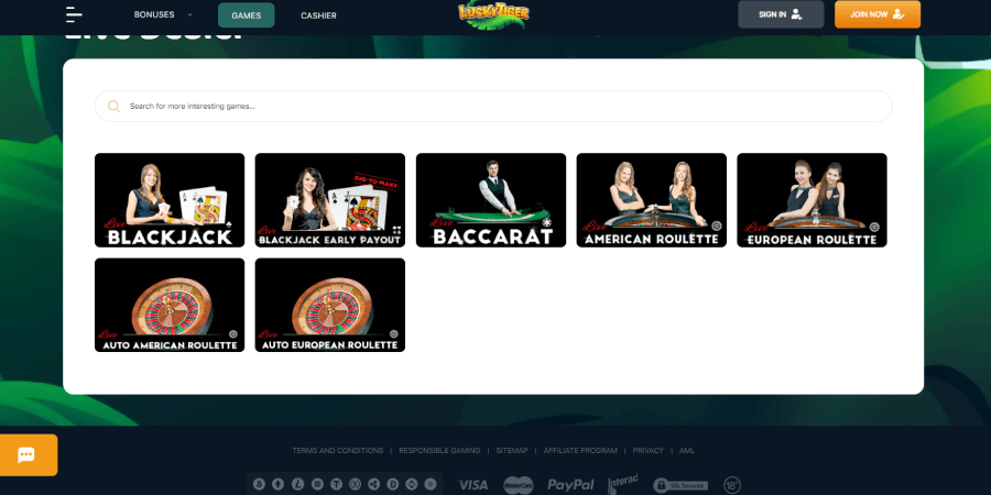The games at Lucky Tiger Casino are provided by a single source. Play a variety of slots, table games including baccarat, blackjack, craps, and roulette, as well as poker variants and a few unique games that are not really slots but are extremely similar. The website does not include a live casino option.
