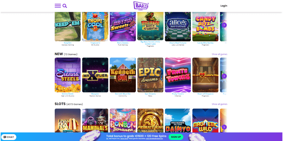 Big Time Gaming, Blueprint, Evolution, Iron Dog Studios, Microgaming, NetEnt, Play'N Go, Quickspin, Red Tiger, Scientific Games, Thunderkick, and WMS are just a few of the industry heavyweights that Barz Casino partnered with to build its game library. Apollo, Alchemy Gaming, Barcrest, Bally, Crazy Tooth Studio, Electric Elephant, Fantasma, Foxium, Fortune Factory, Gameburger Studios, Green Jade, High 5 Games, Hacksaw, Inspired, Just For The Win, Kalamba, Merkur, NoLimit City, Northern Lights, Neon Valley, NYX, Pulse 8 Studios, Push Gaming, Rabcat, Red7, Triple Edge, and many more smaller but competitive suppliers' games are also available.